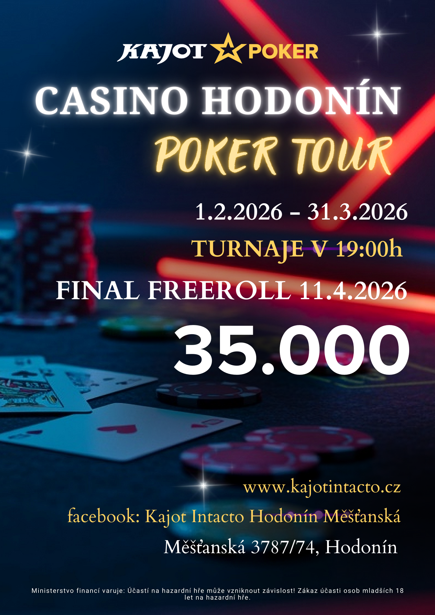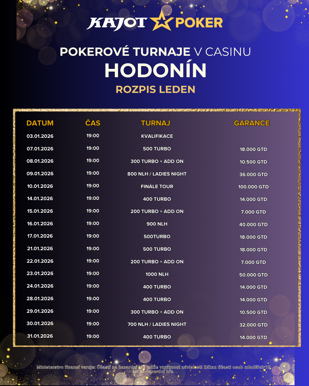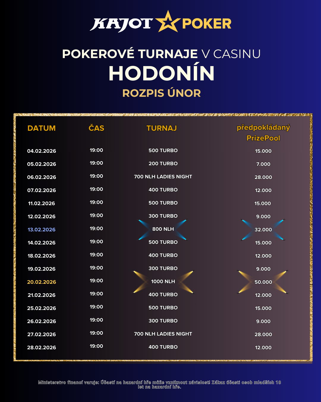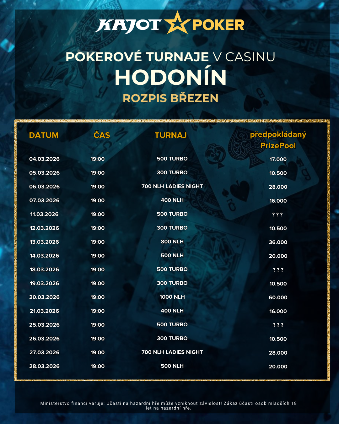 So 18.04.2026 19:00 Hodonín 600 TURBO Prizepool: 20.000 Buy-in: 600 Kč / 25.000 Re-entry: 600 Kč / 25.000 Levels: 15 min Late reg: 22:00 Multi re-entry